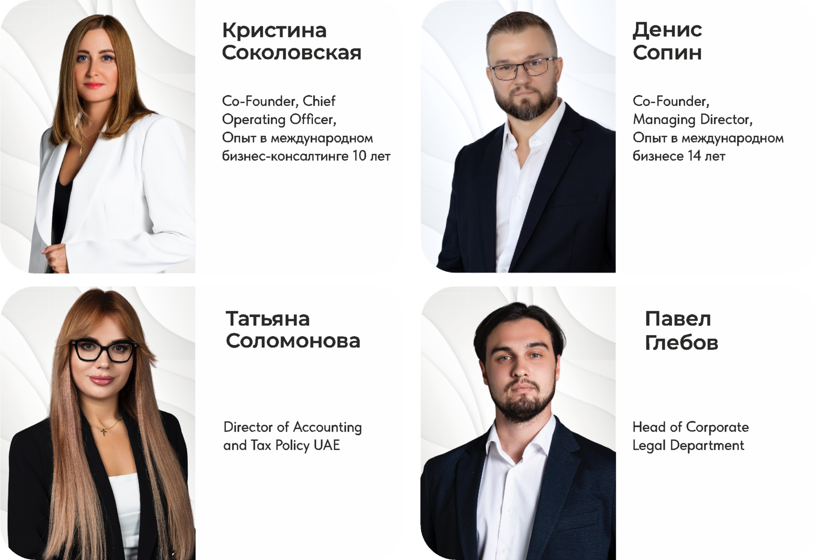 Наша команда состоит из экспертов с более чем 10-летним опытом в миграции, налогообложении, юриспруденции и бизнес-управлении, что позволяет нам предложить глубокую экспертизу в этих областях